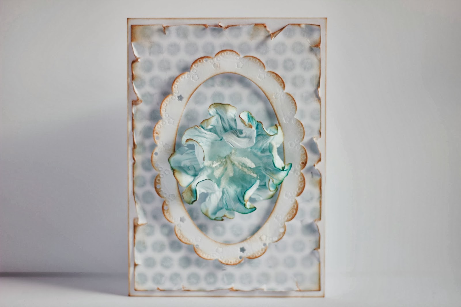 Poniższy kwiat był kremowy, ale używając fioletowej mgiełki przefarbowałam go na bardziej wyrazisty kolor, który wyróżnia się na pudrowym tle. :)