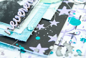 I got my inspiration from all the new stencils we have on Starlight and Mental Vacation collections. I wondered how many stencils can be included to one simple layout and got the answer during the process: quite many. I also got excited with splashes so I created some with Splash! Inks and with Ayeeda mists.